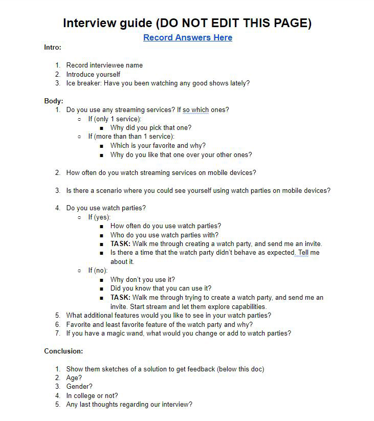 After doing secondary research around the market for watch parties, we still need to know the primary users of our product and understand their needs & pain points. To do this, I drafted up an interview guide and conducted interviews on people who we deem are potential stakeholders. I made sure to follow UX interview standards by providing adequate task lists, avoiding asking leading questions, and prompting follow ups to questions with short answers. I tried to record the interviews down with as much detail as possible, noting important quotes and patterns amongst the interviewees, you can find the interview responses here.