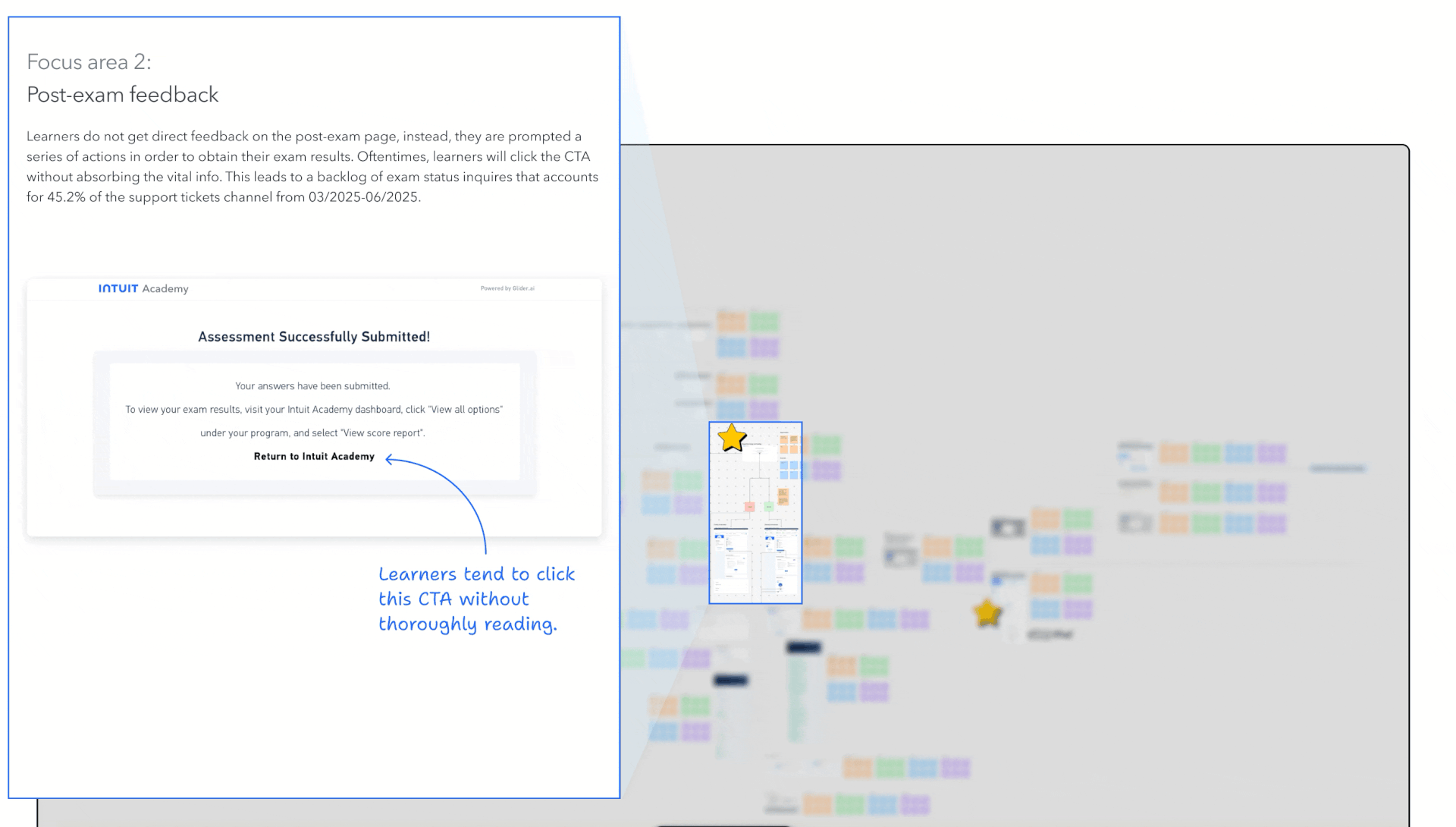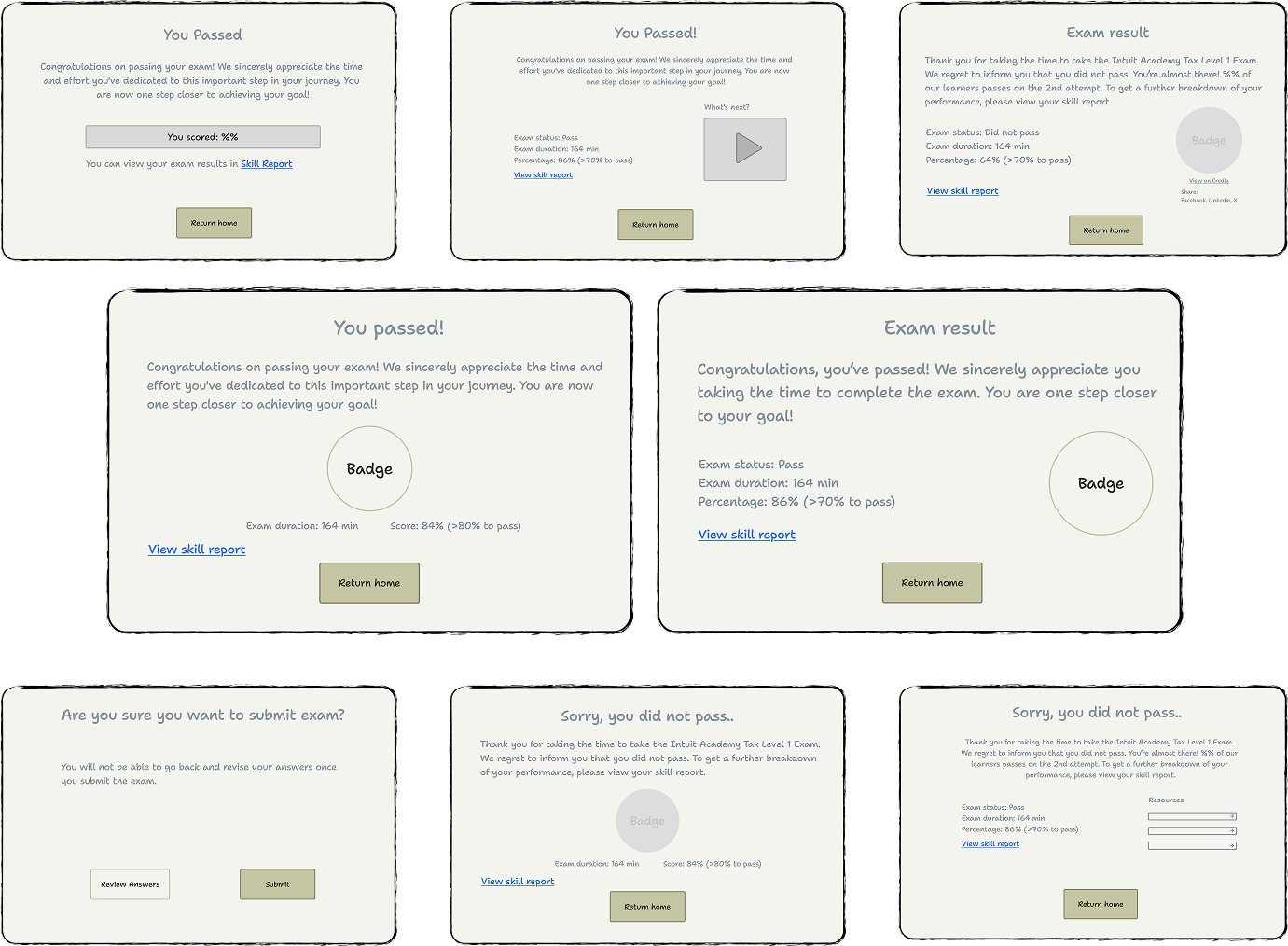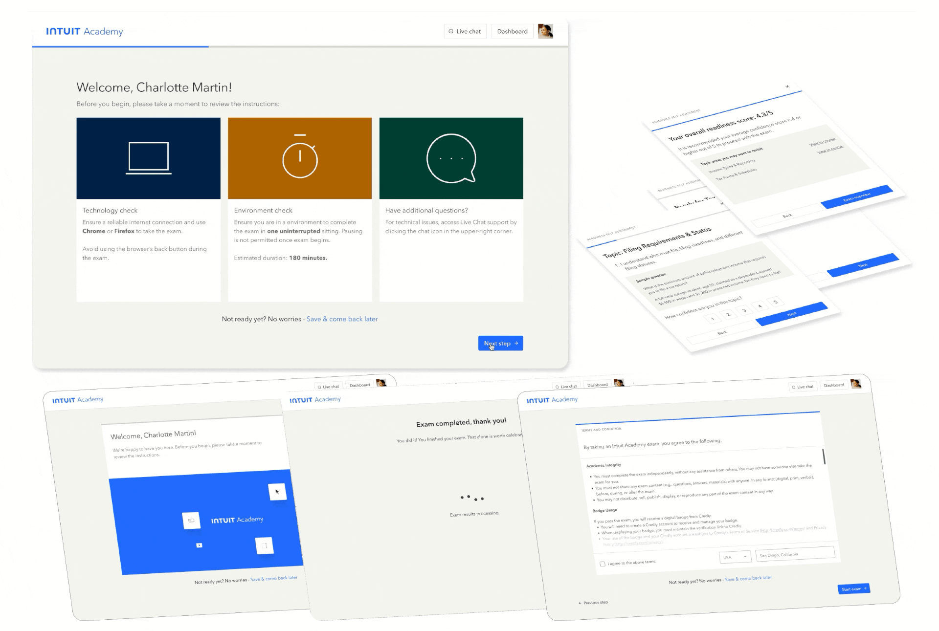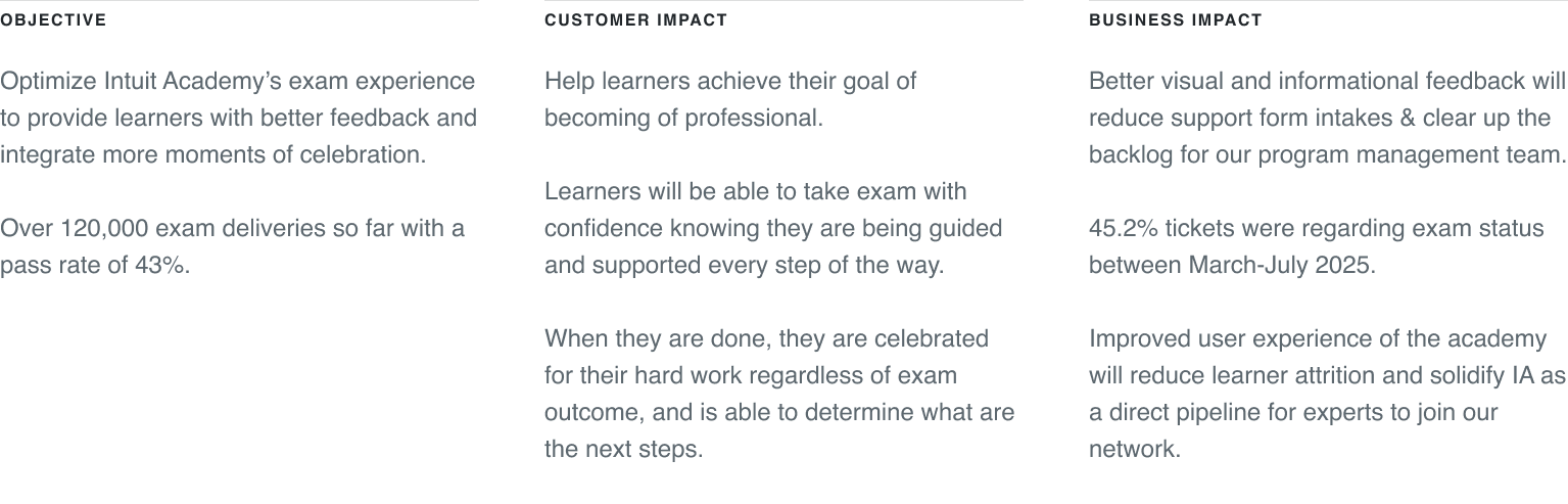 At Intuit, I redesigned Intuit Academy’s exam experience to boost learner confidence, provide clearer feedback, and celebrate progress at every step. With over 120,000 exam attempts and nearly half of our learner support tickets tied to exam inquiries, these improvements reduced operational burden while strengthening the academy as a reliable pipeline for expert talent.