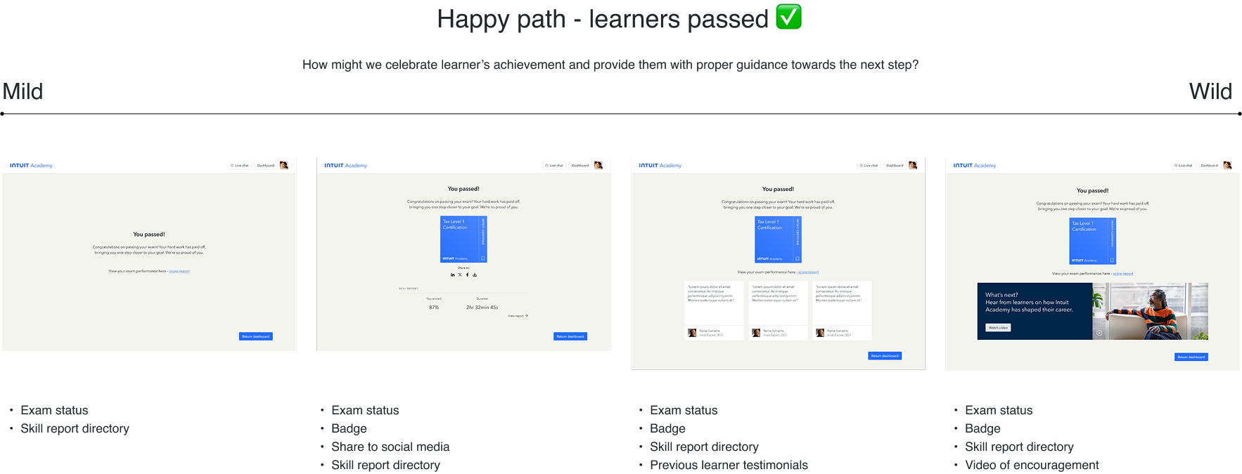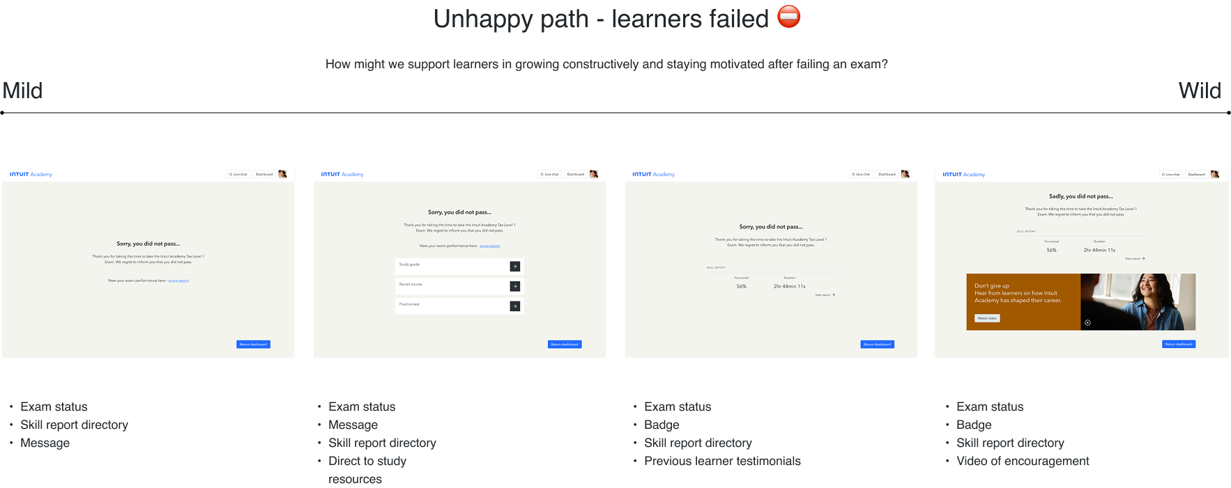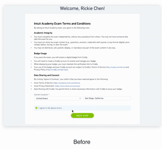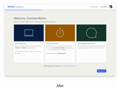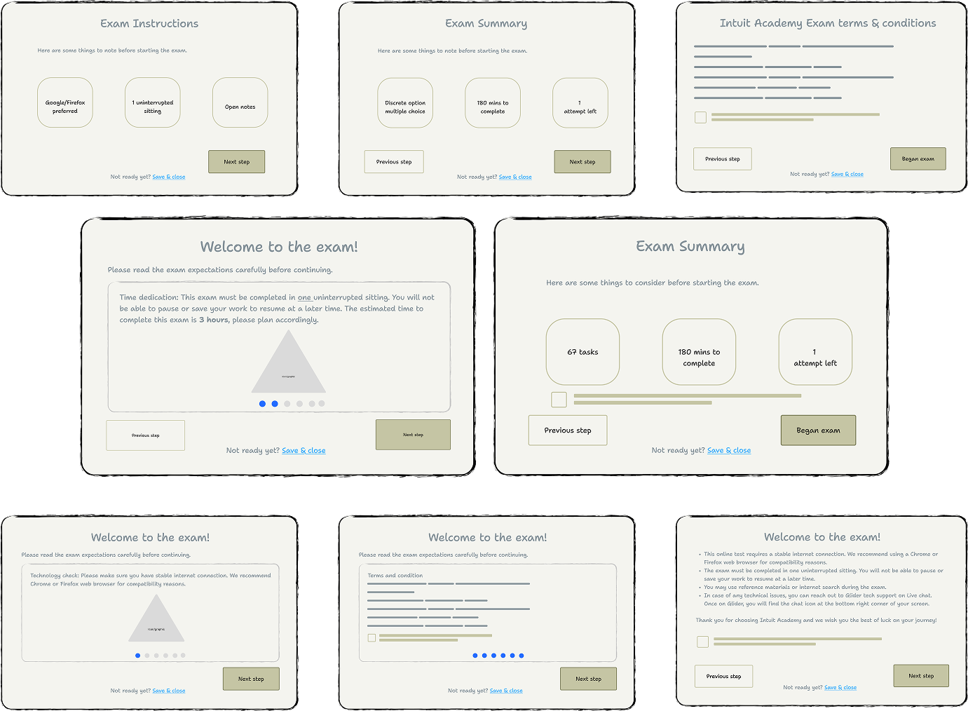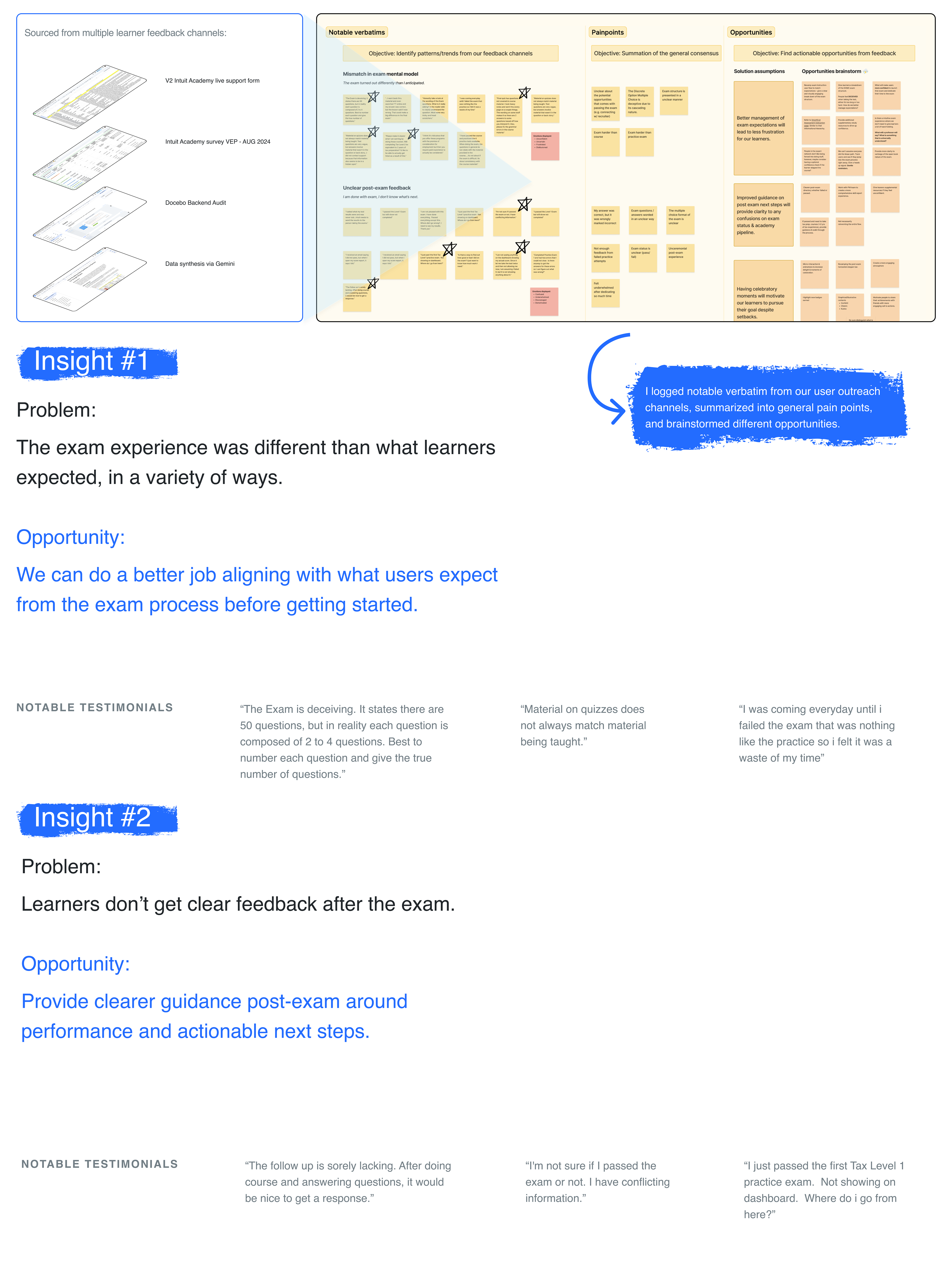 At Intuit, I redesigned Intuit Academy’s exam experience to boost learner confidence, provide clearer feedback, and celebrate progress at every step. With over 120,000 exam attempts and nearly half of our learner support tickets tied to exam inquiries, these improvements reduced operational burden while strengthening the academy as a reliable pipeline for expert talent.