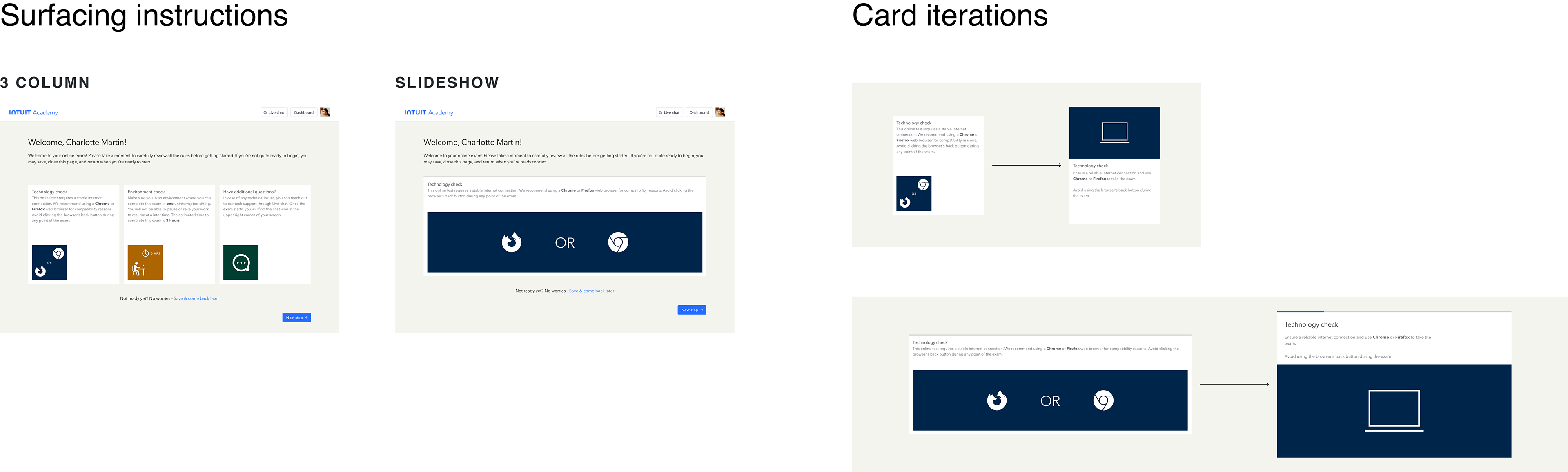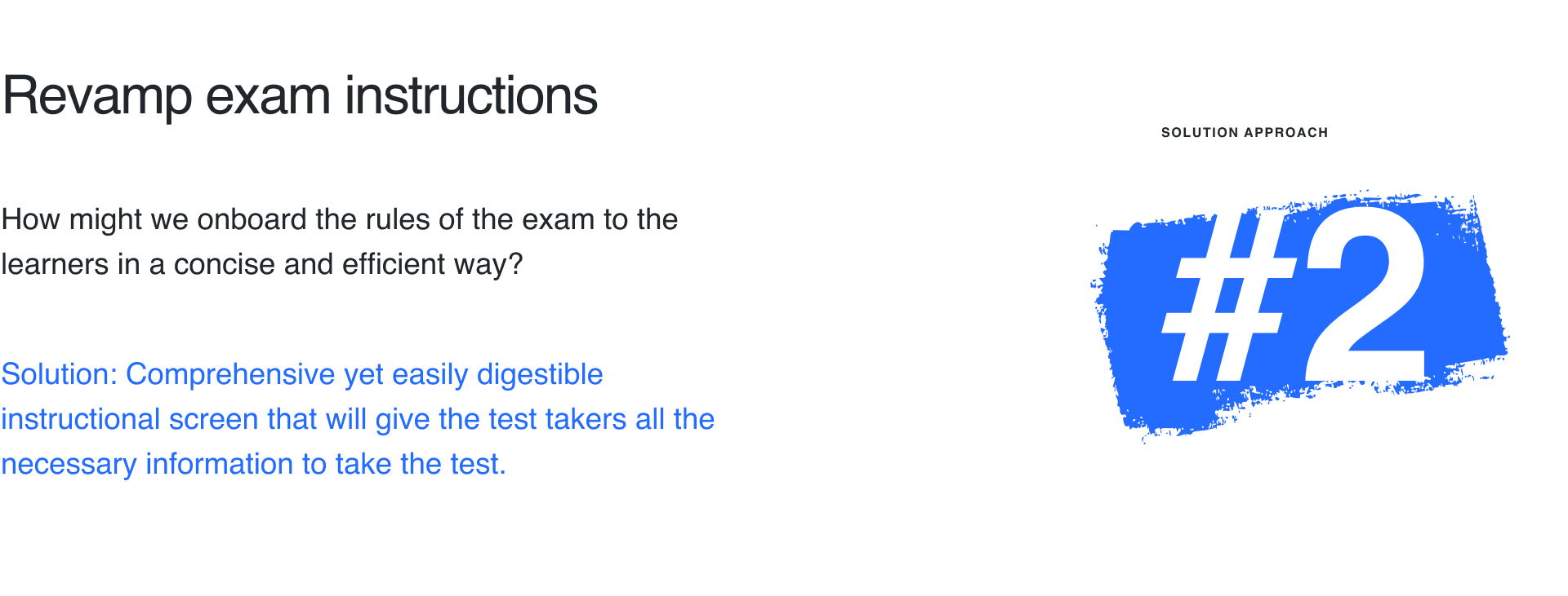 Sketched out what a visual, at-a-glance instructional experience could look like in the exam experience. Advocate for my design decisions and communicate creatively and concisely to secure early buy-in.